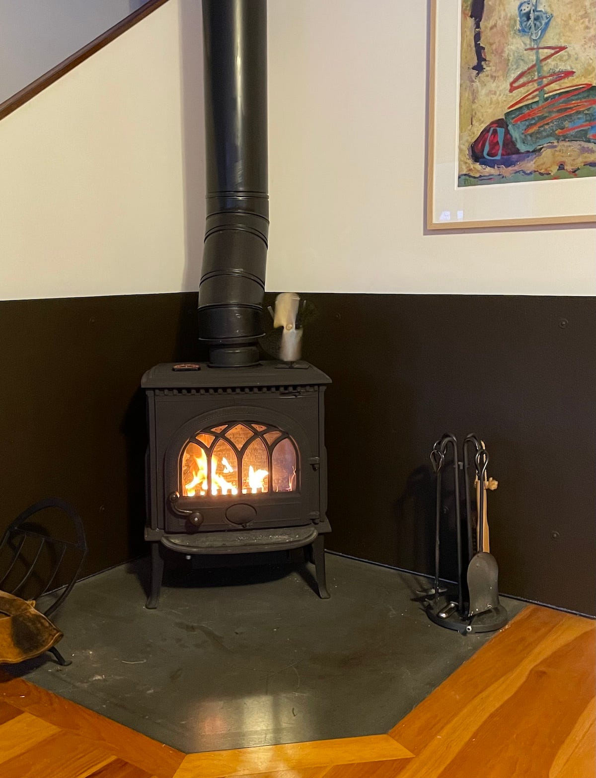 I stay inside where I have the warmth of the wood stove and the painting that sits above it. The image is under glass that always reflects the world inside and outside my house. Other worlds are caught and held by the images in the work itself. Consider this: