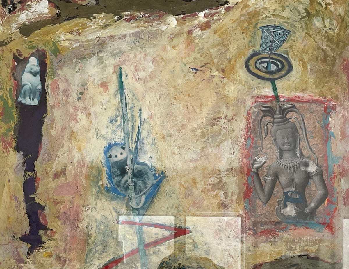 You’re looking the top half of the painting. Left to right: Thoth, the Egyptian god in his baboon aspect, perches in a tree. A possum wraps her tail around a pole. A Hindu devi balances a spinning steel girder on her headdress. The Middle East, the American South, and the vast subcontinent of India are all represented here in the playing field for smoke signals from the universe. You can make your own stories, your own connections to the past, your own predictions about the future.